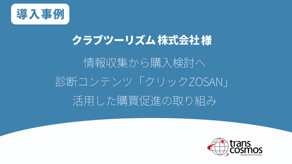 【導入事例】クラブツーリズム様 情報収集から購入検討へ 診断コンテンツ「クリックZOSAN」活用した購買促進の取り組み事例KARTEログ分析流通クリックZOSAN2022-12-07trans+(トランスプラス) 編集部
