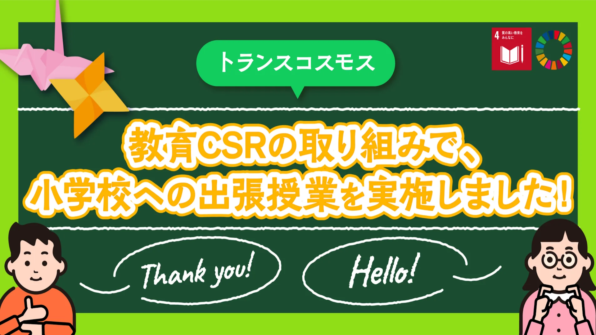 出張授業では、総合的な学習の時間に手話・切り折り紙体験を実施。聴覚障がいのあるトランスコスモス社員が講師を務め「ありがとう・拍手」の手話と切り折り紙で「蝶」をつくるワークショップを開催しました。